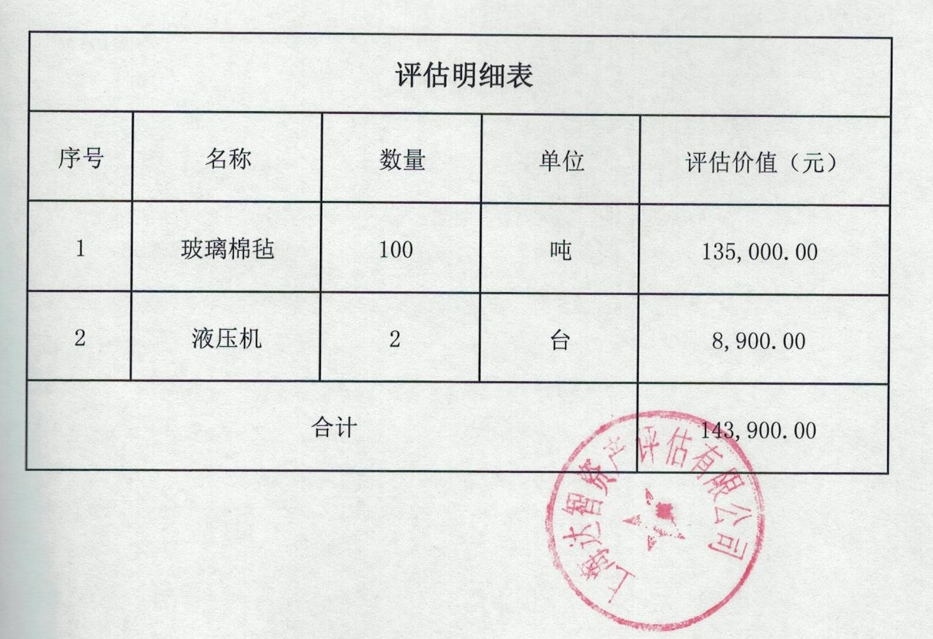 玻璃棉毡一批、液压机2台:玻璃棉毡有搭建的厂房遮盖,标的物以实际现场勘察为准;存放于浙江省德清县新市镇果山头65号院内。(详见评估报告和清单)